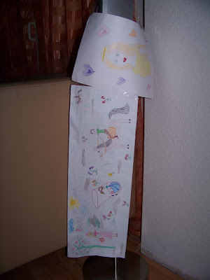 Es que la chiquilla me tiene la casa llena de dibujos e "instalaciones" pegadas por doquier con cintas adhesivas... Son creaciones suyas para las que me deja el cilindro de la cinta adhesiva sin un centímetro más de ésta. A veces los dibujos son de ella solamente. A veces el "arte" es colectivo: papá dibuja algo; mamá también hace sus trazos.
